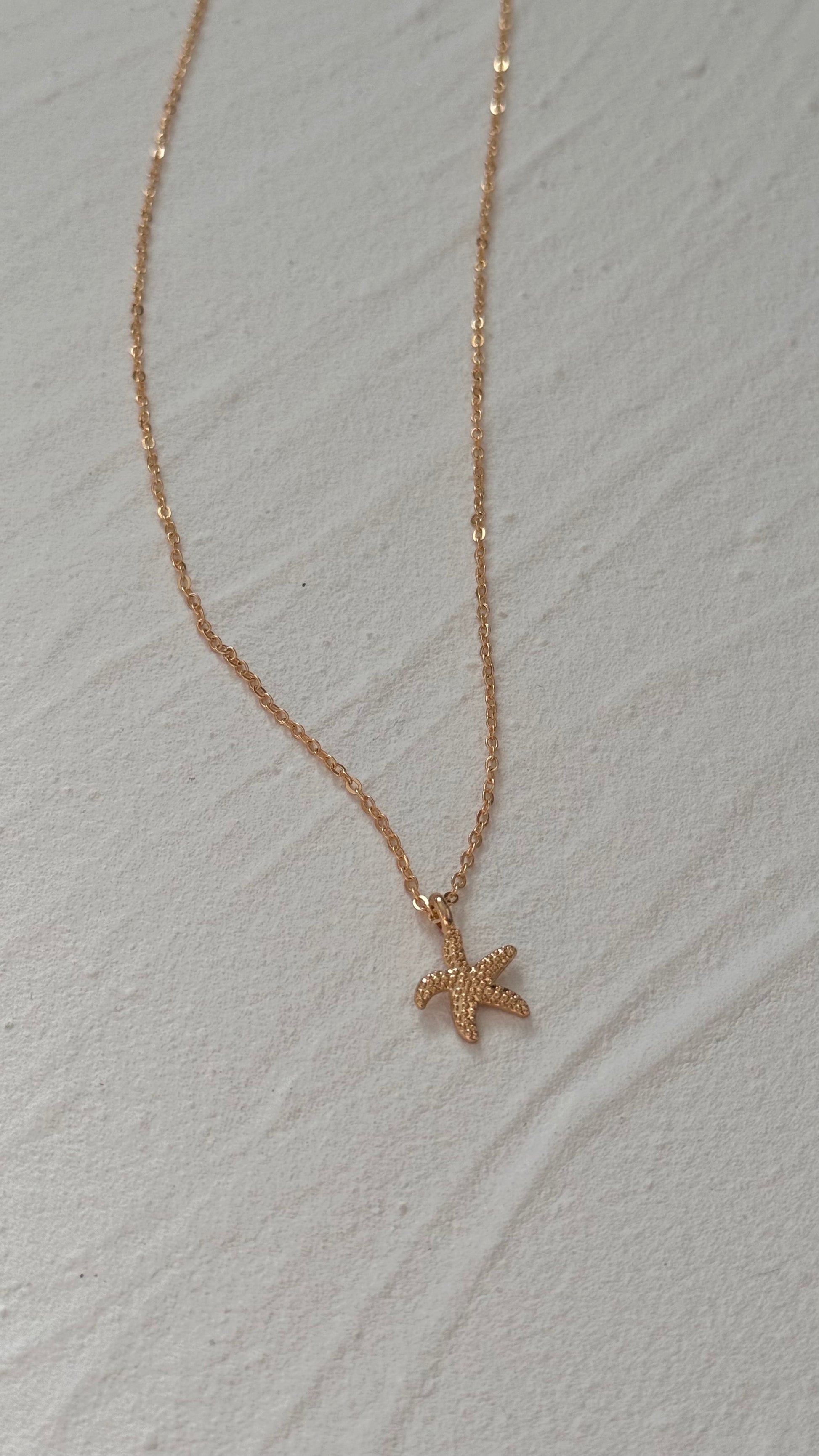 Enhance your summer wardrobe with our stunning golden starfish necklace. The delicate design and vibrant color will add a touch of seaside charm to any outfit. Show off your unique sense of style and make a statement with this beautiful necklace. Order now and shine like a star this summer!
