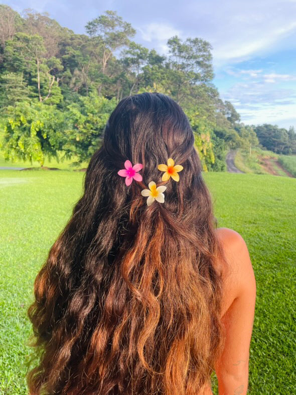 Add a touch of tropical paradise to your hairstyle with our mini frangipani flower clips! These vibrant clips not only secure your hair in place, but also add a pop of color and island charm to any look. Perfect for a day at the beach or a summer night out.
