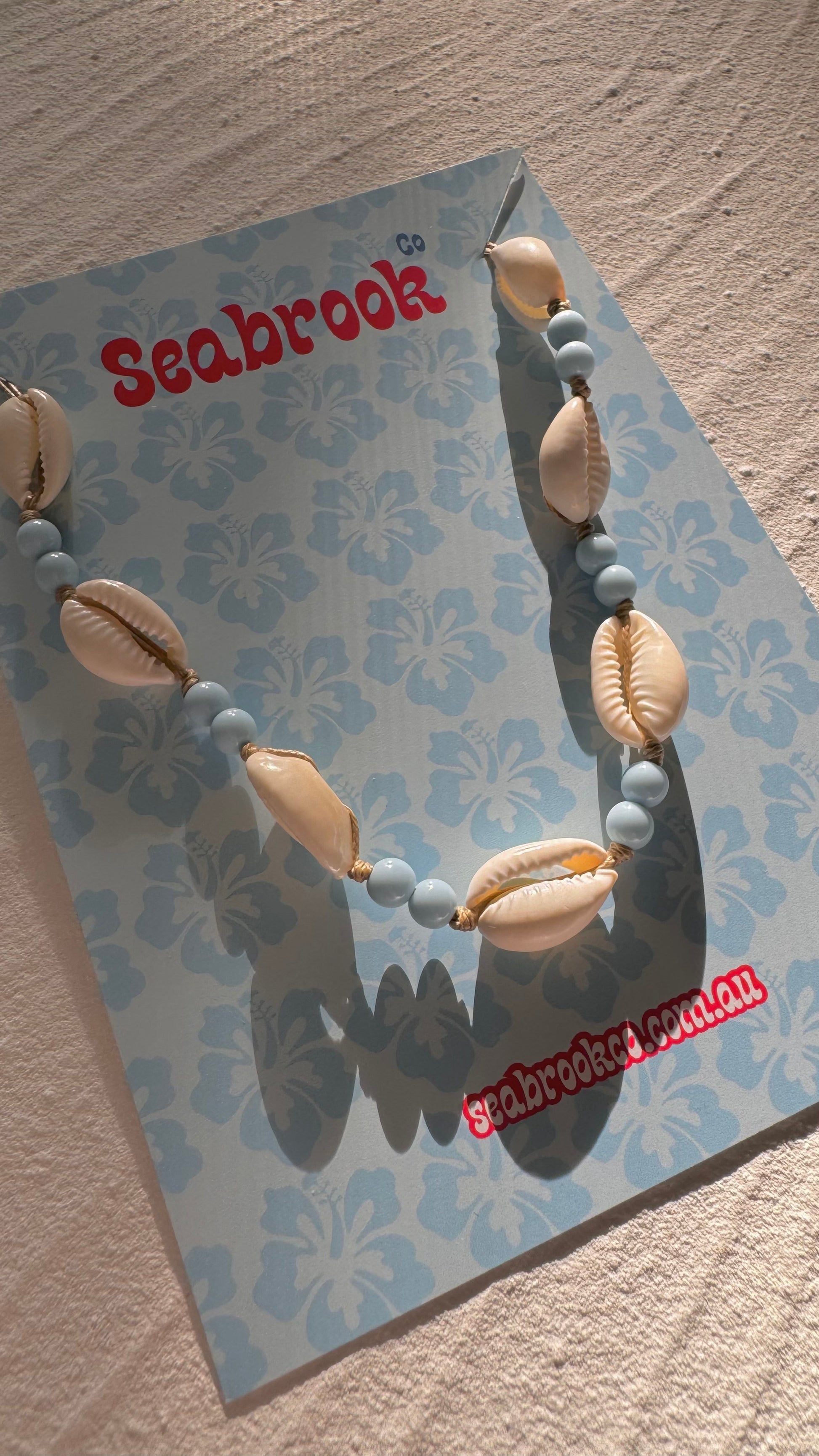 Elevate your island style with our Pale Blue Cowie Necklace! Made with stunning pale blue beads and Cowie shells, this necklace is the perfect accessory for any island girl. Add a touch of natural beauty to your look and embrace the island life with this necklace.