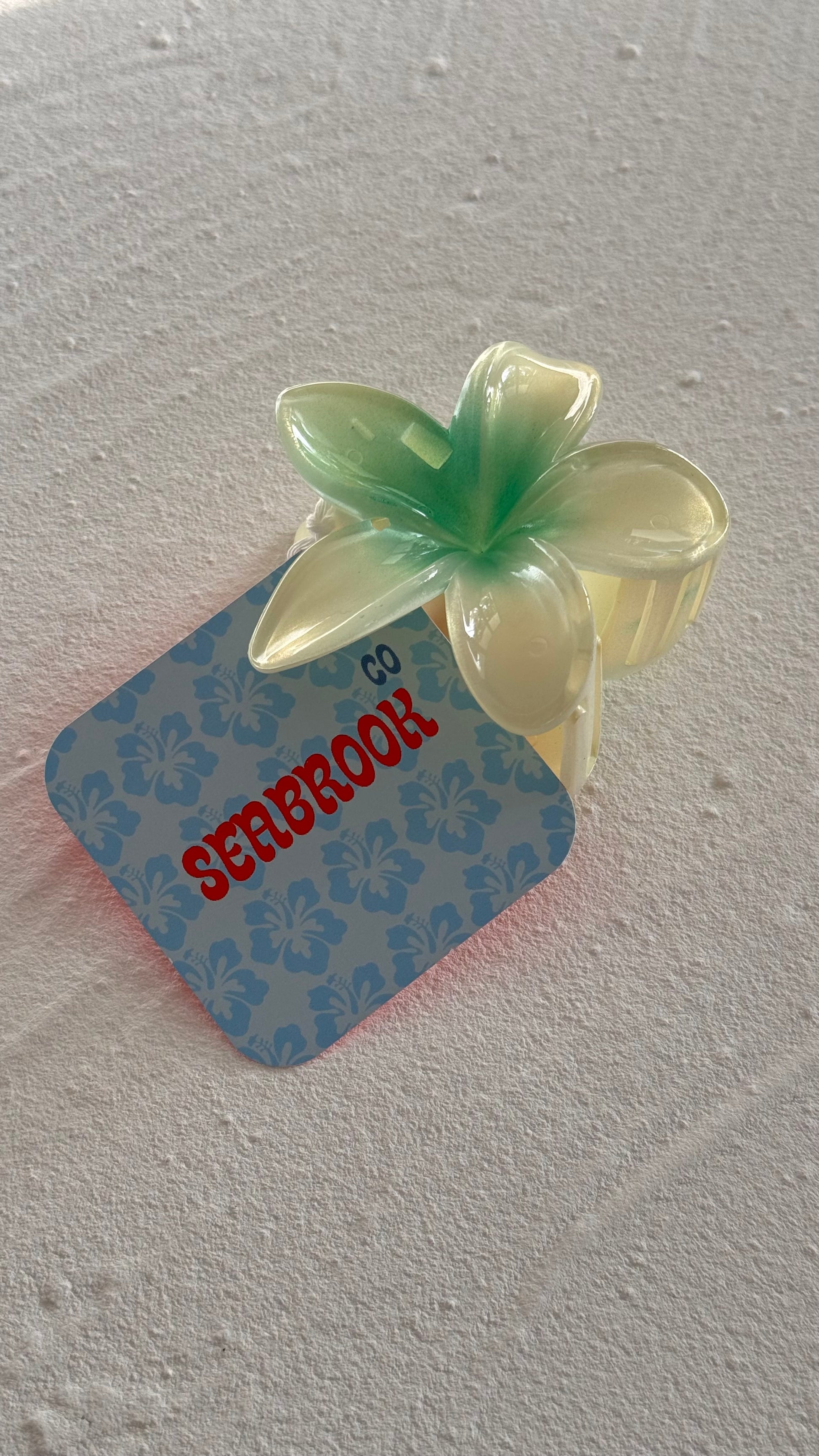 Let your hair bask in tropical vibes with our Frangipani Clip in Pearl Green. Add a touch of beauty with this eye-catching accessory. Perfect for a sunny day out!